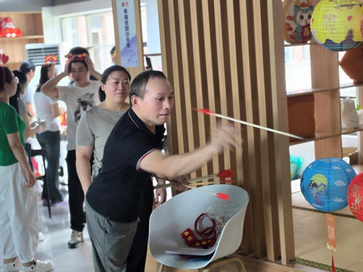 互动游戏区的 “嗨玩双节” 环节则点燃了全场热情。投壶竞技台前,员工们瞄准壶口沉稳投掷,箭矢入壶的清脆声响与围观者的喝彩声此起彼伏,命中率过50%者,现场志愿者准备可爱小礼品。