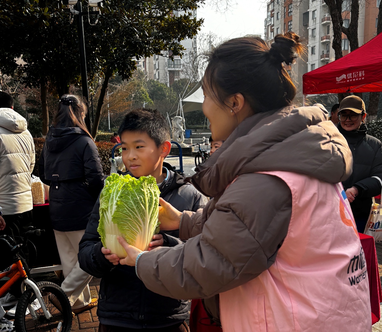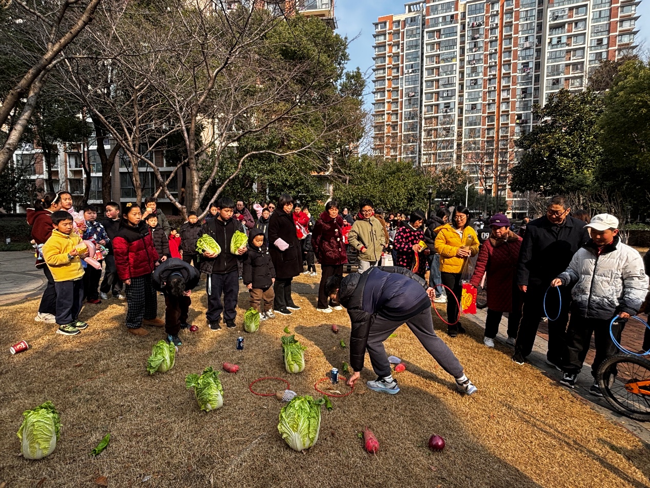 蔬菜套圈环节人气爆棚,兼顾趣味性与实用性,成为居民们追捧的“热门项目”。活动现场,工作人员提前摆放好各类新鲜蔬菜。套圈规则简单易懂,居民们手持套圈,瞄准目标、轻轻一抛,欢呼声、喝彩声此起彼伏。每一次成功套中,都能收获满满的掌声与喜悦。大家相互切磋技巧、分享欢乐,不仅收获了新鲜蔬菜,更在互动中拉近了邻里距离,让年会现场充满了烟火气与幸福感。
