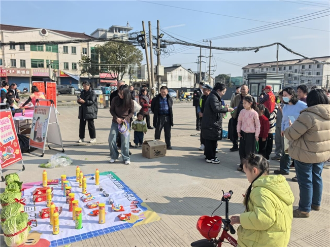 趣味套圈区无疑是现场最具人气的角落,欢呼声、喝彩声此起彼伏。白菜、大米、洗衣液等贴近居民日常生活的实用好物整齐陈列,成为最具吸引力的“战利品”,引得男女老少纷纷驻足参与。居民们有序排队领取套圈,有的凝神定气、目光紧锁心仪奖品,稳稳出手;有的相互支招、彼此鼓劲,分享套圈技巧;小朋友们踮着脚尖、奋力抛圈,脸上满是认真与期待。每当套圈稳稳落中目标,现场便响起一阵欢呼,拿到奖品的居民笑容满面,未套中的也不气馁,继续投身其中,在趣味互动中释放快乐,收获满满幸福感,也让邻里间的陌生感在欢声笑语中悄然消散。“这样的活动太实在了,套中的白菜正好过年吃,既好玩又实惠!”刚套中两颗白菜的王阿姨捧着“战利品”,脸上洋溢着掩饰不住的喜悦。